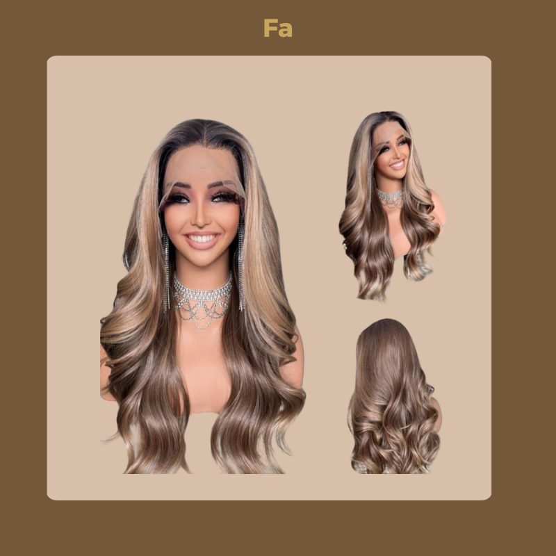 Craquez pour Fa, une perruque longue en fibre synthétique haut de gamme, au brun cendré sophistiqué, rehaussé de mèches blondes subtiles. Ses ondulations douces et son volume naturel apportent éclat et féminité à votre style.